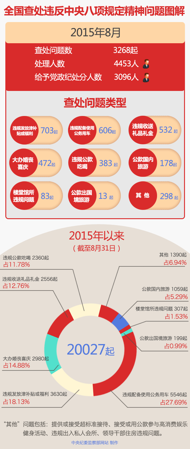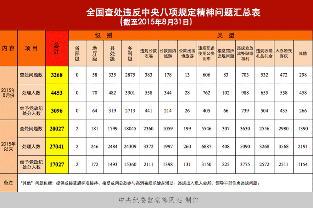 为掌握全国贯彻落实中央八项规定精神情况,中央纪委在31个省区市和新疆生产建设兵团、66个中央和国家机关、111个中央企业、15个中央金融企业建立了落实中央八项规定精神情况月报制度。2015年以来,截至8月31日,全国查处违反中央八项规定精神问题情况如下: