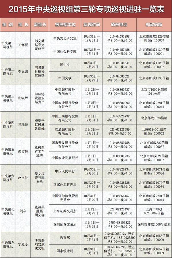开栏的话:经中央批准,2015年中央第三轮巡视对教育部、国务院三峡工程建设委员会办公室、国务院南水北调工程建设委员会办公室、国家统计局、中国气象局、国家林业局、中央党史研究室、中国社会科学院、共青团中央、中国文学艺术界联合会、中国人民银行、中国银行业监督管理委员会、中国保险监督管理委员会、中国证券监督管理委员会、国家外汇管理局、中国投资有限责任公司、国家开发银行股份有限公司、中国中信集团有限公司、中国光大集团股份公司、中国农业发展银行、中国工商银行股份有限公司、中国农业银行股份有限公司、中国银行股份有限公司、中国建设银行股份有限公司、交通银行股份有限公司、中国人寿保险(集团)公司,中国人民保险集团股份有限公司、中国太平保险集团有限责任公司、中国出口信用保险公司、上海证券交易所、深圳证券交易所等31家单位党组织进行专项巡视。截至11月3日,中央巡视组已全部进驻上述31家单位并召开动员会。