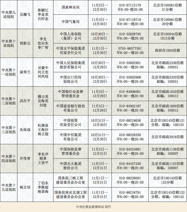 中央巡视组将在中国银行工作2个月。巡视期间(11月2日—12月31日)分别设专门值班电话:010-88360537,专门邮政信箱:北京市100044信箱1011分箱。巡视组每天受理电话的时间为:早8:00—晚20:00。>>更多