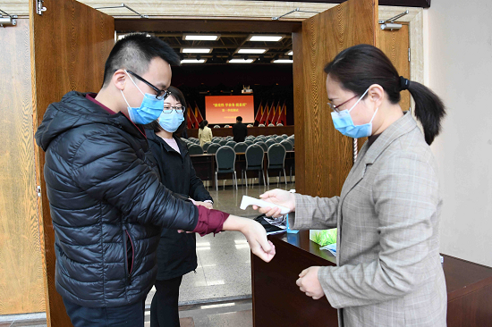 “体温36.5度,正常,请您用酒精免洗手液进行消毒后按座位有序入场参加考试。”4月3日下午,一场特别的考试正在丰泽区中心会场进行。