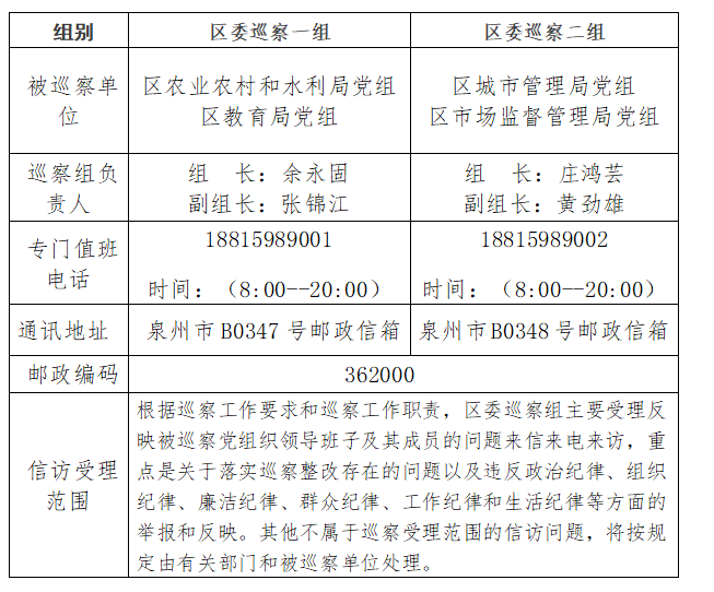 根据《中国共产党章程》《中国共产党巡视工作条例》、省委《巡视工作实施办法》《关于加紧推进市县全覆盖的通知》、市委《巡察工作实施办法》以及区委《巡察2017-2021五年规划》关于巡察“回头看”的要求,本次巡察的主要任务是以习近平新时代中国特色社会主义思想为指导,深入贯彻党的十九大和十九届二中、三中、四中、五中全会精神以及十九届中央纪委五次全会、省纪委十届六次全会、市纪委十二届六次全会和区纪委五届六次全会精神,围绕中心、服务大局,全面贯彻巡视工作方针,落实政治巡察要求,增强“四个意识”、坚定“四个自信”,把“两个维护”作为根本任务,紧扣被巡察党组织职能责任,深入查找政治偏差,对落实管党治党政治责任进行再传导,对抓好巡视巡察反馈问题整改落实进行再督促、再检查。同时检查“三个聚焦”(即聚焦贯彻落实党的理论路线方针政策和党中央决策部署以及省委、市委、区委工作要求情况;聚焦落实全面从严治党战略部署情况;聚焦领导班子和干部队伍建设情况)再落实情况。重点加强对落实习近平总书记重要讲话精神批示精神情况的监督,加强对制度执行、权力运行情况的监督,对贯彻落实党中央关于决胜全面建成小康社会、决战脱贫攻坚、统筹推进新冠肺炎疫情防控和经济社会发展各项决策部署的监督,加强对文化遗产保护领域、民生领域奢侈浪费问题、《中国共产党基层组织选举工作条例》贯彻落实以及省委、市委、区委工作要求情况的监督,发挥监督保障执行、促进完善发展作用。为作答市委三大时代命题,加快“五个泉州”,建设丰泽“现代化城市核心区”、实现赶超目标、决胜全面建成小康社会提供坚强保证。
