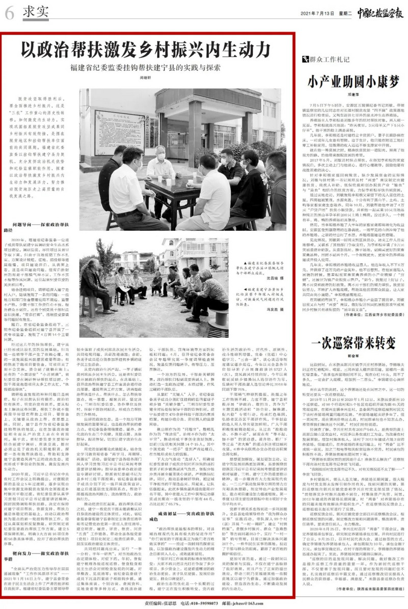 今天,《中国纪检监察报》、中央纪委国家监委网站联合推出《以政治帮扶激发乡村振兴内生动力——福建省纪委监委挂钩帮扶建宁县的实践与探索》一文,报道省纪委监委开展政治帮扶的经验做法。