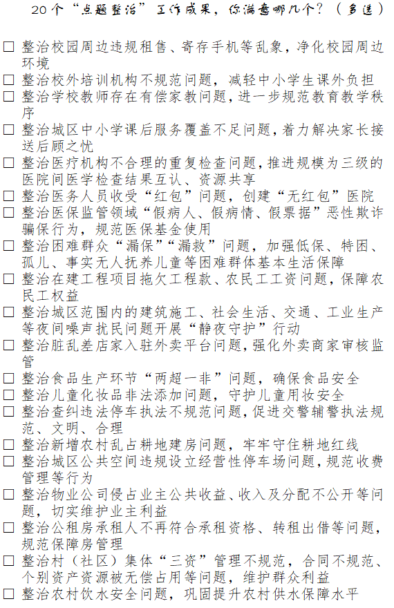 对“点题整治”开展情况和实际效果是否满意?有什么意见建议?