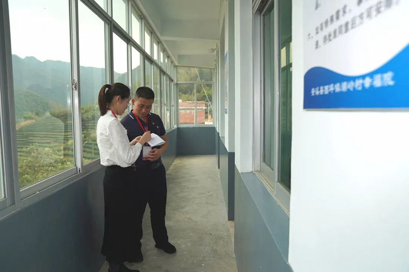 谢杰峰(右)实地测量湖岭村村部墙壁的粉刷面积