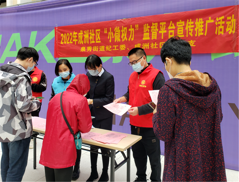 为进一步规范和保障“小微权力”平台正常运行,加大“小微权力”推广宣传力度,12月2日下午,泉秀街道纪工委监察组在领SHOW天地Q立方开展“小微权力 监督一点通”宣传活动。