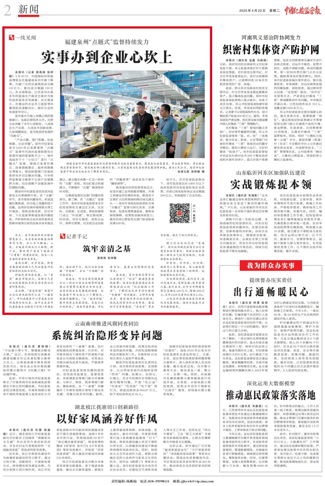 4月22日《中国纪检监察报》新闻版头条报道了泉州“点题式”监督持续发力 实事办到企业心坎上的经验做法