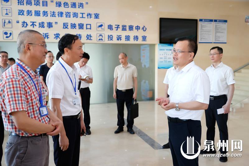 蔡战胜来到泉州市政务服务中心,了解公共资源交易平台建设及工程领域专项整治工作情况(陈晓东 摄)